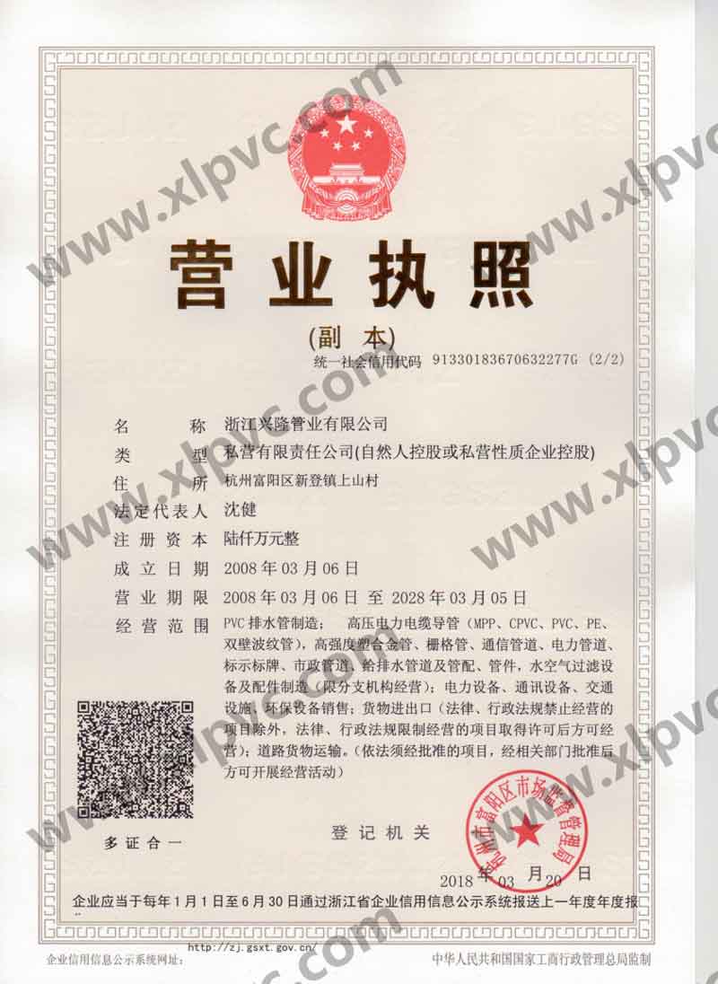 浙江興隆管業(yè)有限公司位于杭州市富陽區(qū)(杭州第九新區(qū)),坐落在新登鎮(zhèn),相距杭州僅60公里,水、陸、空交通運(yùn)輸十分便利。浙江興隆管業(yè)有限公司前身為富陽興隆塑料制品廠,成立于1992年,2008年改名浙江興隆管業(yè)有限公司,數(shù)十年來,公司一直至力于管道的生產(chǎn),目前公司擁有國(guó)內(nèi)先進(jìn)的CPVC保護(hù)管生產(chǎn)線,HPVC()雙壁波紋管生產(chǎn)線,多孔管生產(chǎn)線,玻璃鋼電纜保護(hù)管生產(chǎn)線、MPP電纜保護(hù)管生產(chǎn)線。生產(chǎn)的主要產(chǎn)品有:CPVC電纜保護(hù)管、MPP電力電纜保護(hù)管(頂管)、高強(qiáng)度塑合金管、HDPE給排水管、HPVC()雙壁波紋管、玻璃鋼電纜保護(hù)管、埋地通信用的PVC-U多孔管、PE直壁管、PVC-U雙壁波紋管、梅花管等,年生產(chǎn)能力達(dá)20000萬米。